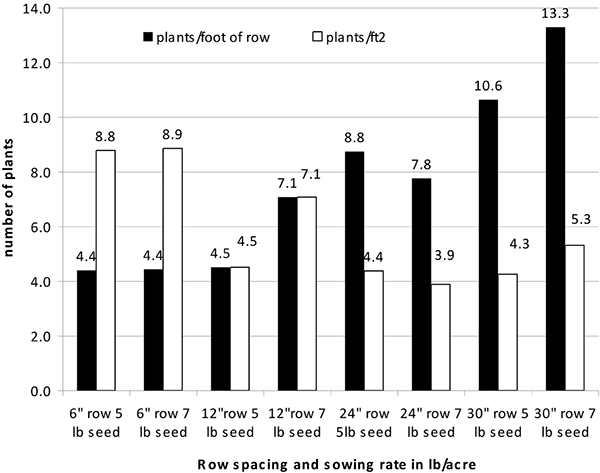 Stand counts were taken for all treatments at both the 5 and 7 lb/ac sowing rates on two 3.3-ft-long row elements in each plot after harvest. Plant stems in each row element were counted. Plants per linear foot of row and plants per square foot were computed using the average of the two row elements.