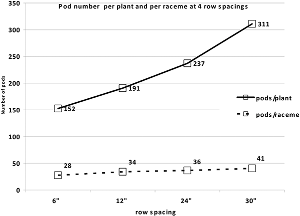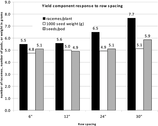 Yield component data show that canola plants compensated for increased row spacing by branching more and by increasing both the number of pods per plant and pods per raceme. Canola plants did not significantly increase 1,000-seed weight (seed size) or seeds per pod to compensate.
