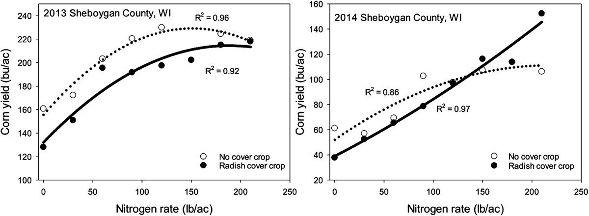 Figure 1 shows the effect of radish across two different growing seasons in Sheboygan, WI (located in northeast Wisconsin). In 2013, corn following radish appeared to require more N to optimize yield than following no cover crop. In 2014, lack of rainfall suppressed yields, but corn following radish outyielded corn following no cover crop at the higher N rates. In neither case did the radish appear to supply N. In these climates, radish decomposed quickly when the soils warmed up in the spring. The N trapped in the biomass is released quickly—perhaps too quickly—and does not remain available in the surface soil for the corn crop (although actual fate of this N remains unknown). It should be noted that we never saw a negative effect of the radish on corn yield and twice saw slight yield increases (although more N was required to achieve the increase in yield). Thus, while there may be some benefits to radish as a cover crop, there is no evidence that it will supply N to corn, and farmers should not alter their N applications.