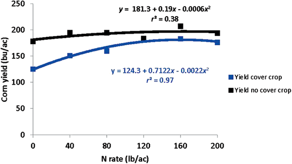 The corn N response equations from Figure 3 indicate that N rate required for maximum yield with cover crops was 162 lb N/ac while the N rate required to maximize yield with no cover crop was 161 lb N/ac. In terms of economic optimum N rate (EONR), assuming $3.50 corn price and $0.40/lb N cost, the EONR for no cover crop was 0 lb N/ac while the EONR with the cover crop was 136 lb N/ac. In terms of residual N plus N rate, the economic optimum N (EON, which includes residual nitrate N plus N rate) is 77 lb N/ac for the no-cover-crop treatment and 178 lb N/ac for the cover crop treatment. The cover crop, therefore, had an N drag of about 100 lb N/ac compared with no cover crop (which was similar to the total difference in available N in the soil profile), and the economic loss from the cover crop was about $57/ac due to lost yield at maximum and the cost of additional N. These data clearly demonstrate that cover crop use will benefit water quality (i.e., preventing nitrate from leaching out during the winter and early spring) but can come at a cost to agronomically available N (i.e., more N may be required following certain cover crops) and agronomic productivity. The reduction in yield due to the cover crop could not be explained by soil moisture differences since there were no significant differences in spring soil moisture at planting between treatments.