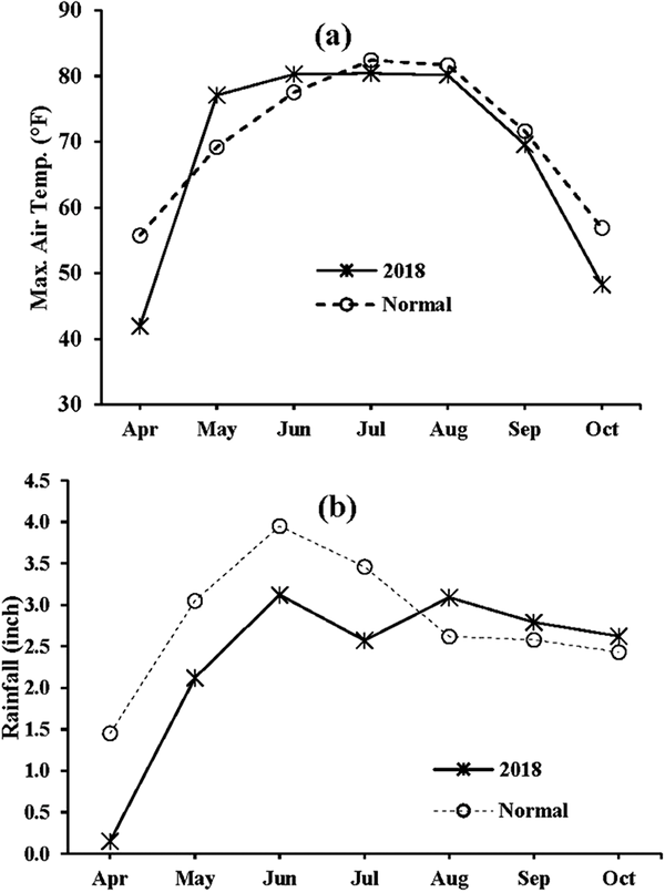 During 2018 growing season, two growers’ fields located at Buffalo and Chaffee in eastern North Dakota were selected for this experiment. Details of the experimental sites are presented in Table 1. Monthly average of maximum air temperature and rainfall during the growing season (April through October) from the Prosper, ND weather station of the North Dakota Agriculture Weather Network (https://ndawn.ndsu.nodak.edu/) close to the two sites are presented in Fig. 1. The early to middle part of the growing season (May through July) had lower rainfall than normal; and maximum air temperature was also higher than normal in May. Seven treatments consisted of three fertilizer N (in the form of urea) application rates: 100% (150 lb N/ac), 75% (110 lb N/ac), and 50% (75 lb N/ac) of recommended N, with and without nitrapyrin (Instinct HL, Corteva AgriSciences, 2.5 lb a.i./gal), at the rate of 24 fl oz/ac along with a control (no fertilizer N). Treatments were laid out in randomized block design with four replications. Plot size was 25 ft long and 11 ft wide. Fertilizer N was hand-broadcast just before planting and incorporated to surface soil using tillage equipment. Phosphorus and potassium fertilizers were not applied due to high soil test values according to the current recommendation (Franzen, 2016). Sunflower (oilseed-type cultivar) was planted and growers were responsible for in-season cultural operations. Surface soil samples 0 to 1 ft deep were collected from each plot two and four weeks after planting. Soil samples were analyzed for inorganic N (NH4+ and NO4_) concentration by extracting with 2 M KCl and subsequently analyzed with a Timberline ammonia analyzer (TL-2800, Timberline Instruments, Boulder, CO). At maturity, sunflower heads of the middle two rows of each plot were harvested by hand by clipping the head from the stalk as close to the head as possible and putting it into burlap bags. Sunflower heads were oven-dried at 104°F to a moisture between 8 and 10% prior to being threshed. Threshing of sunflower heads was conducted using an Almaco low-profile plot thresher (Almaco, Nevada, IA). Sunflower seed grain yield was weighed; moisture and test weight were determined on a seed grain subsample using a Dickey-John GAX500XT moisture and test weight meter (Dickey-John, Auburn, IL). Yields were adjusted to 10% moisture. Statistical analysis of seed yield and soil inorganic N after two and four weeks was conducted using a randomized block design using PROC GLM procedure under SAS 9.4 software (SAS Institute Inc., Cary, NC). Mean separation of treatments was performed using the LSD at 95% significance level.