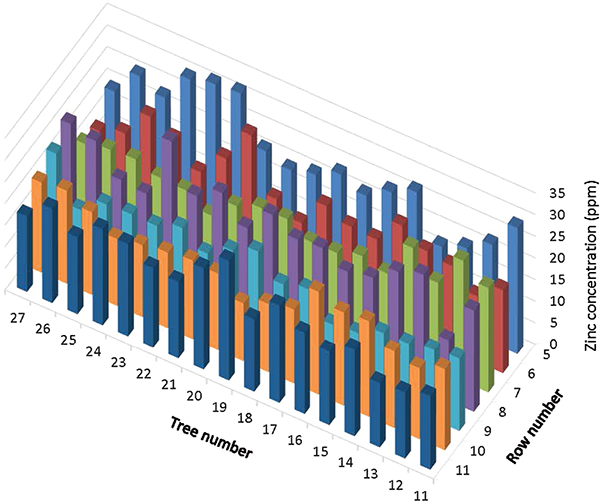 In each of seven contiguous rows (six Wichita and one Western row), 17 adjacent trees were selected for sampling. Foliar samples were collected from each of the 119 trees in this area on July 18, 2018. Samples were collected according to standard sampling protocol (Heerema, 2013). Samples were collected only from fruiting branches. Leaves were thoroughly washed, dried, and analyzed for nutrient concentrations. Soil below each tree was individually sampled in February 2019 and analyzed to determine available nutrient levels, pH, salinity, sodicity, and cation exchange capacity. The goals of this study were to measure the degree of variability of foliar nutrient concentrations exhibited by these trees as well as to determine the importance of different sources of variation. This discussion will focus solely on the degree of observed variability of foliar zinc concentrations.