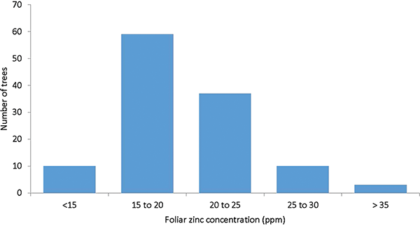 Although the average of measured zinc concentrations within the sampled area (19.9 ppm) exceeded the minimum level known to limit photosynthesis (about 15 ppm), some trees were well below this limit. Photosynthesis rate, vegetative growth, and nut production of the trees containing lower levels of zinc are potentially limited by lack of zinc. It is desirable to manage zinc such that trees in each orchard block with the lowest concentrations exceed a minimal acceptable zinc level. Because it is not practical or economically feasible to sample each tree individually, it is necessary to establish orchard-wide minimum nutrient concentration recommendations. We propose to do this by using estimates of tree-to-tree variability to convert individual tree response data into commercially applicable orchard standards.