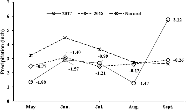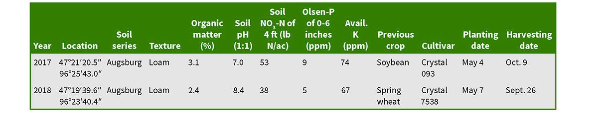 Field trials took place at a grower’s field near Ada, MN during the 2017 and 2018 growing seasons. Site location and basic soil properties are presented in Table 1. Monthly rainfall data of the growing season were collected from the North Dakota Agricultural Weather Network website (https://ndawn.ndsu.nodak.edu/) and are presented in Figure 1. Before planting, representative bulk soil samples from 0- to 6-, 6- to 24-, and 24- to 48-inch depth increments were analyzed for available nitrate N (NO3–N) while samples from the 0- to 6-inch depth only were analyzed for available phosphorus and available potassium using soil test methods recommended for the Northern Great Plains (NCR 221, 1998).