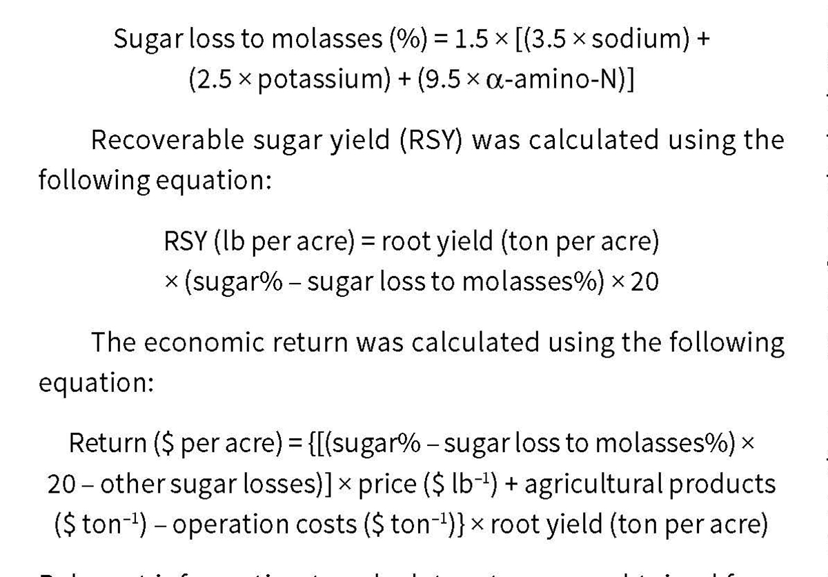 Relevant information to calculate return was obtained from Tyler Grove, General Agronomist at the American Crystal Sugar Company in Moorhead, MN (personal communication). Amino N was determined by the copper method using a spectrophotometer at a wavelength of 610 nm (International Commission on Uniform Methods for Sugar Analysis, 2007), and potassium and sodium were determined by flame photometry.