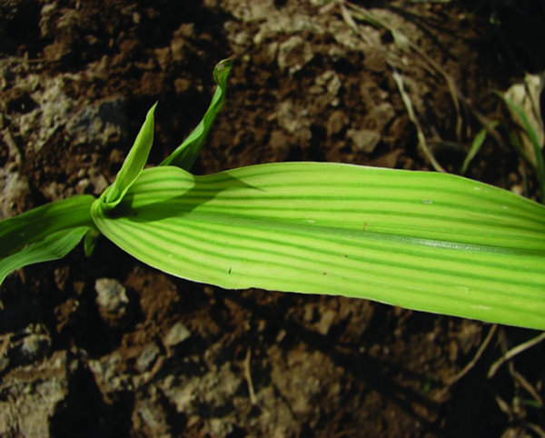 Iron deficiency symptoms have stark, defining characteristics and are similar across most crop species (Figures 2, 3, and 4). Immature iron-deficient leaves develop chlorosis (yellowing) between the leaf veins while the veins initially remain green. If the plant does not obtain iron, the symptoms become more severe, and the deficient leaves become pale yellow to white in color. Chlorophyll–protein complexes in the chloroplast require iron and the absence of usable iron perpetuated this condition. Young tissue displays deficiency symptoms first because iron is mostly immobile within plants. The severity of iron deficiency chlorosis (IDC) reflects the corresponding iron availability and plant utilization of each incidence. Iron soil chemistry can also have important effects on the availability of other plant-essential nutrients such as phosphorus (P). Iron and P will bond to form precipitates and secondary minerals like strengite (FePO4 • H2O) in acid and flooded conditions and reduce P availability.