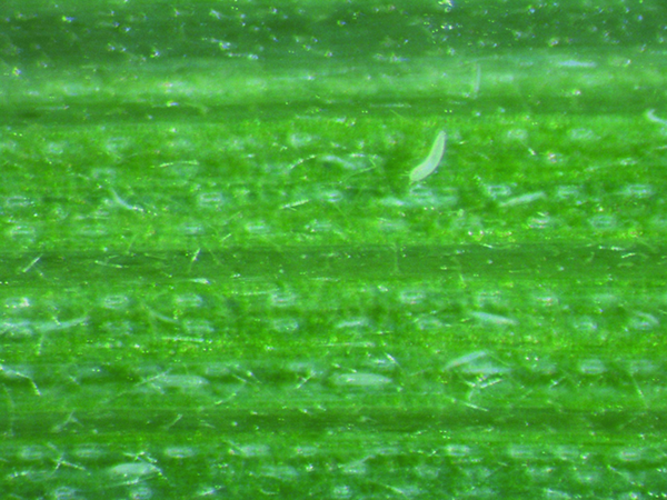Wheat streak mosaic virus (WSMV) was first described in Illinois in 1919. Since that time, it has been found worldwide, occurring in a diversity of crops including wheat, barley, durum, corn, and many grassy weed species. It is vectored by a very small eriophyid mite, the wheat curl mite. Symptoms include stippling or streaking of leaves, stunting, and yellowing. In the spring, symptoms can be easily confused with nutrient deficiencies. However, nutrient deficiencies are generally consistent throughout a field, whereas WSMV is usually patchy and concentrated at field edges where the prevailing wind blew the vector into the field.