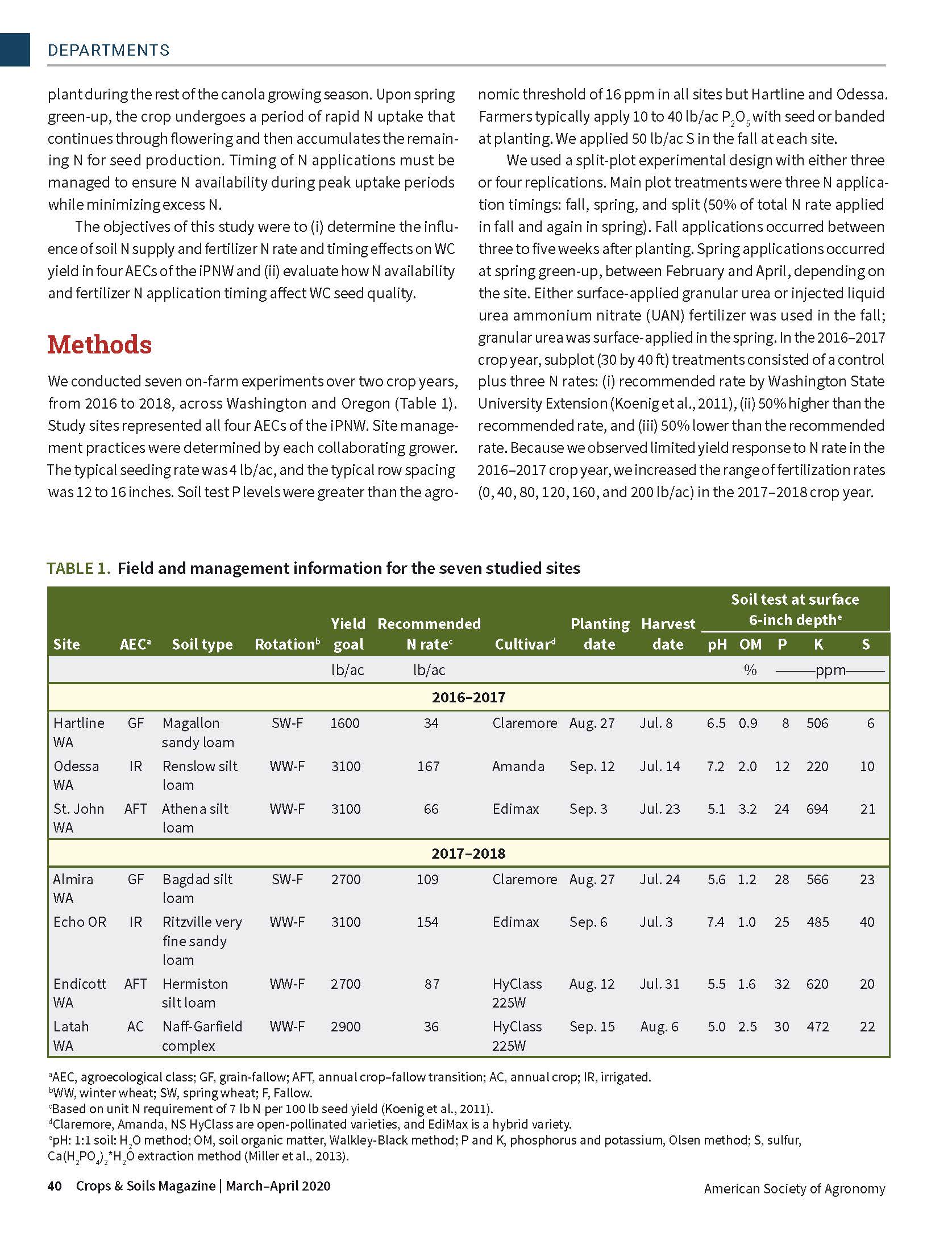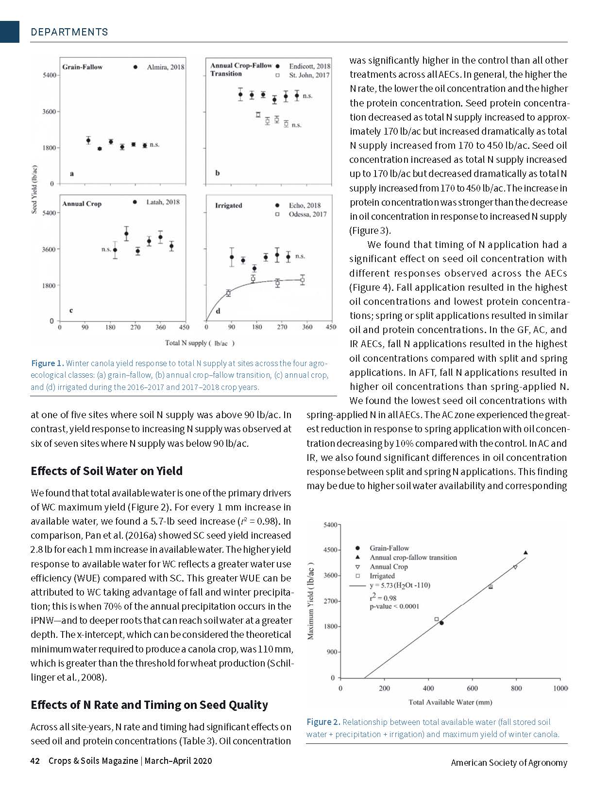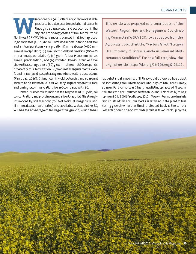 Winter canola (WC) offers not only marketable products but also excellent rotational benefits through disease, weed, and pest control in the dryland cropping systems of the inland Pacific Northwest (iPNW). However, little regional fertility research has been conducted on WC. The objectives of this study were to (i) determine the influence of soil N supply and fertilizer N rate and timing effects on WC yield in four iPNW agroecological classes and (ii) evaluate how N availability and fertilizer N application timing affect WC seed quality.