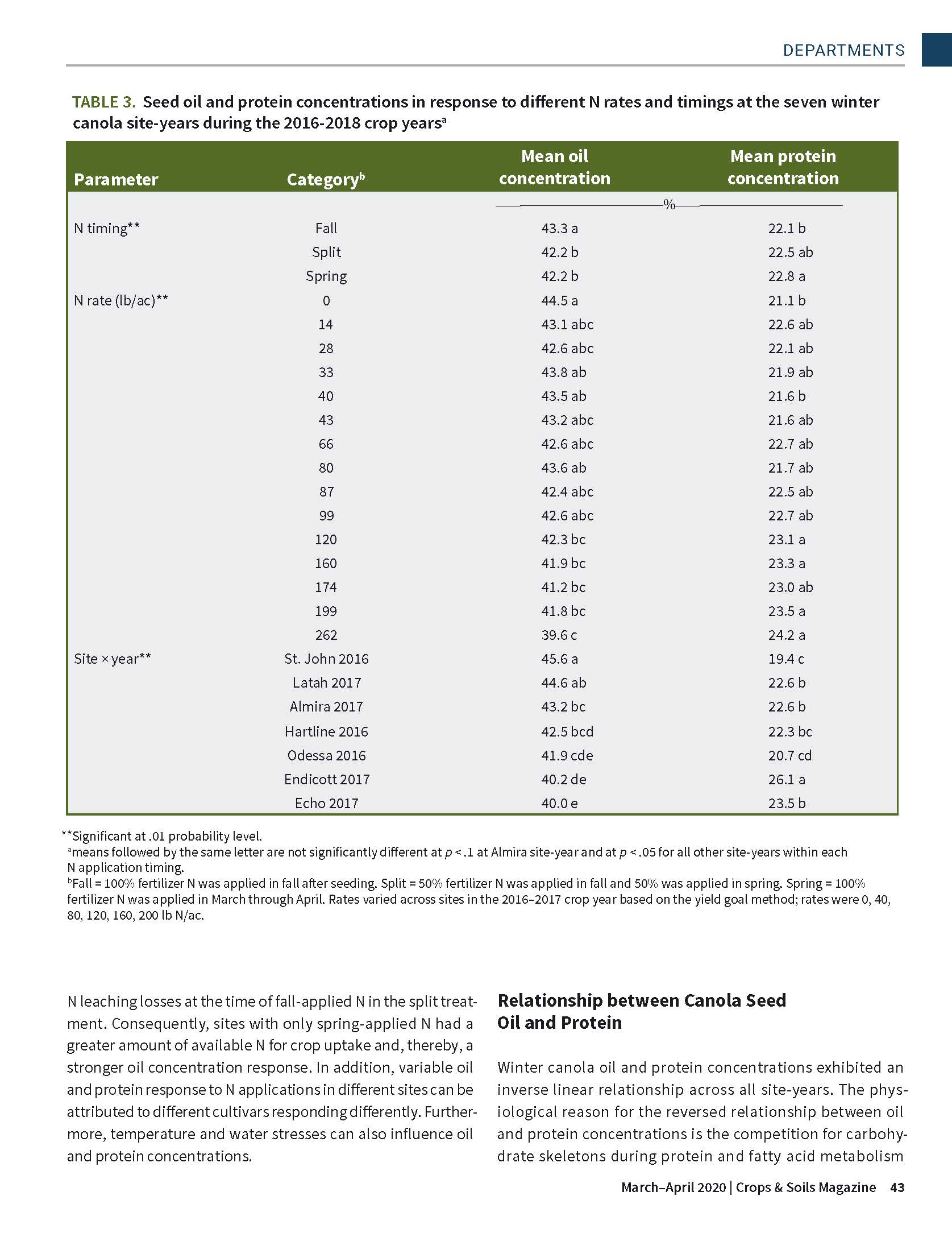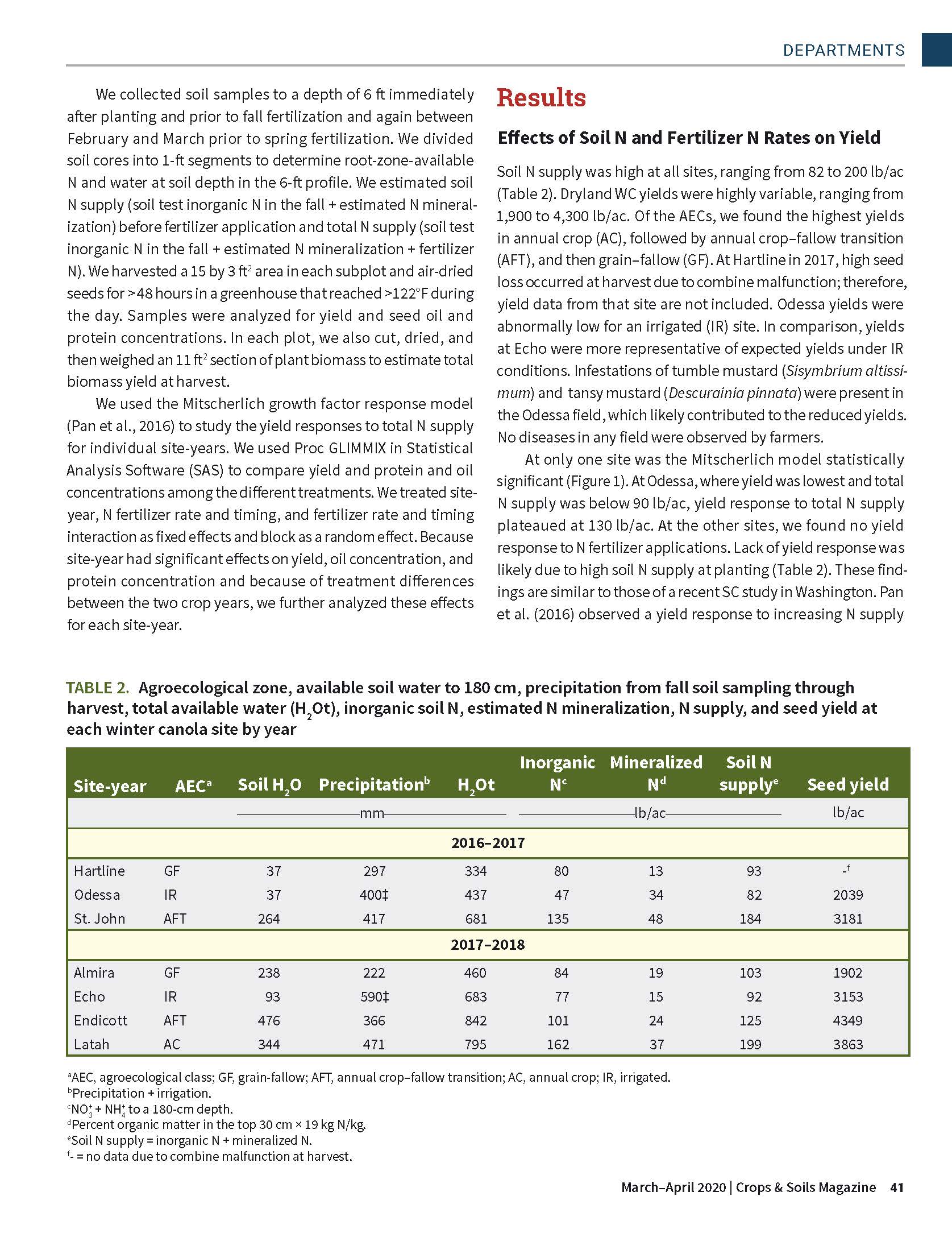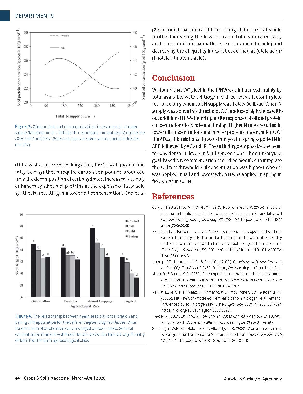 Winter canola (WC) offers not only marketable products but also excellent rotational benefits through disease, weed, and pest control in the dryland cropping systems of the inland Pacific Northwest (iPNW). However, little regional fertility research has been conducted on WC. The objectives of this study were to (i) determine the influence of soil N supply and fertilizer N rate and timing effects on WC yield in four iPNW agroecological classes and (ii) evaluate how N availability and fertilizer N application timing affect WC seed quality.