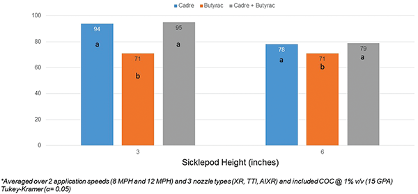 - Nozzle type and application speed did not influence the control of sicklepod when applying Cadre and/or Butyrac.
