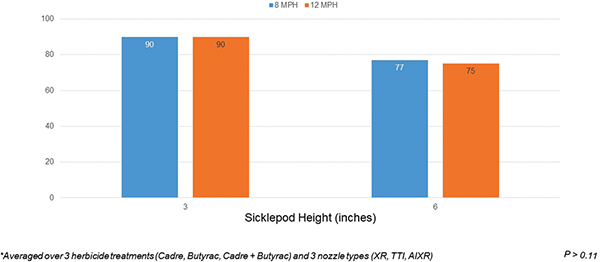 The study was arranged as a randomized complete block design with factorial arrangement of treatments with five replications and two independent experimental runs. Postemergence herbicide applications were made using a three-nozzle research track sprayer with nozzles spaced 20 inches apart and 20 inches above the plants applied at 15 GPA and at 40 PSI to sicklepod plants that were either 3 or 6 inches tall. Nozzles with the same spray angle (110°) but different orifice sizes (04 and 06) were used to keep the application volume consistent when changing the application speed.