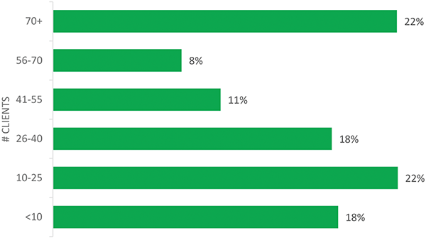 We are often asked how many clients/farmers and acres a typical CCA covers. These were new questions in 2020, so we do not have a comparison from 2013. As you can see in the graph below, 30% of the CCAs say they provide services to 56 or more clients on a regular basis. When asked about acres, 28% say they are working with 40,000 or more acres (see graph on the next page). Naturally, this will greatly depend on the types of crops being grown.