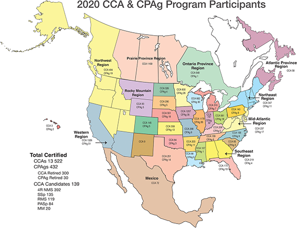 The ICCA Program has more than 27 years of history with the first testing taking place in 1993. There are 13,522 CCAs throughout North America represented by 34 local boards and served by more than 400 volunteers. According to the survey, the average age decreased from 50 to 48 between 2013 and 2020 while the percentage of women CCAs increased from 7 to 14%. In terms of education, 90% of the CCAs have at least an associate degree while 77% have at least a Bachelor of Science degree. The vast majority, 85%, work in the private sector with ag retail/farm cooperative type positions leading the way at 63%, which is no significant change from 2013. The top three inputs sold by CCAs also remained the same: fertilizer, seed, and crop protection.