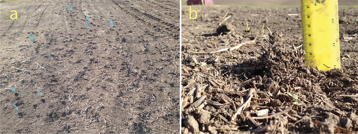 Anecic species tend to be large (3 to 6 inches) and build permanent, deep, vertical burrows that connect to the soil surface where they feed on plant residues. Anecic earthworms create middens, which are small mounds of organic material and casts (earthworm excretions) at burrow openings. Middens are an easy-to-see (Figure 3), physical indication of the presence of anecic species, particularly in the early spring. The only known native species in the iPNW (Driloleirus americanus, or the “giant Palouse earthworm”) is anecic and has only been found in soils that have never been tilled (Sánchez-de León & Johnson-Maynard, 2009). Lumbricus terrestris, commonly known as the “nightcrawler,” is an exotic anecic earthworm found in no-till agricultural soils in the iPNW and throughout the world. Measured densities of L. terrestris in iPNW agricultural soils are low; however, most studies have utilized hand-sorting as a collection method, which is not an optimum method for quantifying populations of deep-burrowing species (Xu et al., 2013; Walsh & Johnson-Maynard, 2016).