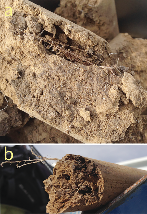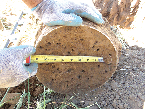 Like casting, burrowing activity also has direct influences on soil properties. The deep, vertical burrows of anecic species create pathways that can increase water infiltration into the soil profile (Shipitalo & Butt, 1999; Capowiez et al., 2009) and percolation of water throughout the soil profile (Figure 4). Roots oftentimes grow preferentially though old or even active earthworm channels. The relatively deep channels created by anecic earthworms can provide a route for roots to extend beyond dense, compacted, or clay-enriched soil horizons, which are common in the iPNW (Figure 4). Roots that are limited to old earthworm channels are not uncommon in deep soil cores collected from agricultural fields in the iPNW (Figure 5). Deep rooting increases opportunities for water and nutrient uptake, likely benefiting crop growth. Extensive horizontal burrows created by endogeic species can also increase water infiltration as a high density of large pores near the soil surface, though discontinuous, allows water movement (Ernst et al., 2009; Capowiez et al., 2014).