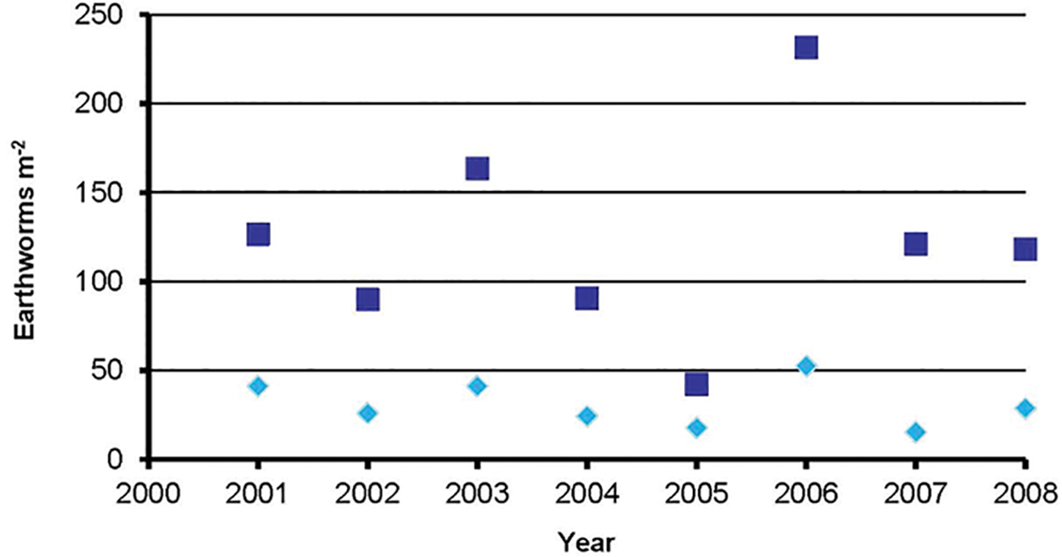 Agricultural practices directly influence earthworm habitats, primarily through the types of inputs used, the crops grown, and mechanical operations. Overall, agricultural practices influence two main factors: (1) the quality and quantity of food available to earthworm populations and (2) the amount of disturbance caused to their habitat. In general, reducing tillage disturbance or adopting no-till practices results in larger earthworm population density (Chan, 2001; Emmerling, 2001; Ernst & Emmerling, 2009). In a side-by-side comparison, the density of endogeic earthworms ranged from 22–42 earthworms m–2 in chisel-plowed soils compared with 62–111 earthworms m–2 under no-till after three years of divergent management (Johnson-Maynard et al., 2007). This study, which was conducted within the iPNW, suggests that reduced tillage can nearly double earthworm density in as little as three years (Figure 7) in systems dominated by endogeic species. This result is likely due to differences in direct mortality, environmental conditions, or crop residue (food source) between the two tillage treatments.