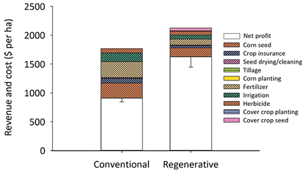 Research on multi-component regenerative ag systems is more expensive and challenging to design and implement vs. small-plot replicated studies evaluating a limited set of treatments and with limited variability across plots. A small but growing body of research supports benefits including research by LaCanne and Lundgren (2018) that found pests to be 10 times more abundant on conventional corn farms compared with regenerative farms. Regenerative grain fields had 29% lower production but 70% higher profits over traditional corn production systems (Figure 1). Profit was positively correlated with soil organic matter content, not yield. The authors chose a logical but arbitrary divider to separate regenerative from conventional farmers. To be considered regenerative, farmers had to have implemented at least three practices that are included in regenerative systems.