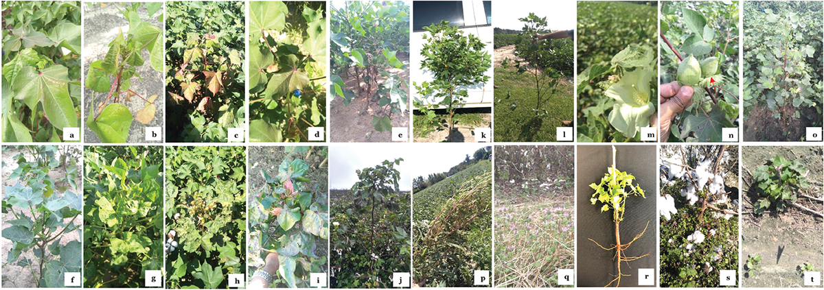 In late infections, the plants show leaf deformation (Figure 2g), crinkling (Figure 2h), leaf rugosity (Figure 2i), shorter internodes (Figure 2f,j), bushy foliage (Figure 2k), fewer boll retentions (Figure 2l), deformed flowers (Figure 2m), and “parrot-shaped” bolls (Figure 2n). In some cases, plants with extended nodes of 32–36 internodes were observed (Figure 2o) with no harvestable bolls (Figure 2l,o). Similar symptoms were also observed from other cotton-growing regions in the U.S. On volunteer cotton and basal regrowth, symptoms like leaf deformation, shorter leaves, dwarf, and shorter internodes were observed (Figure 2p,q).
