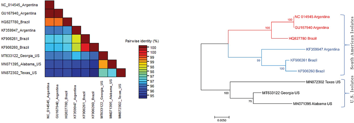 The genome of CLRDV is linear, monopartite, ssRNA (+) of 5,866 bp in length. In the U.S., the genome sequence of CLRDV from Alabama, Georgia, and Texas has been elucidated and is publicly available in the GenBank (www.ncbi.nlm.nih.gov/genbank). The genome sequence from Georgia is 95 to 98% identical to the genome of other CLRDV isolates from the United States (Alabama and Texas) and South America (Figure 3). In the phylogenetic analysis based on full-length nucleotide sequences, the U.S. isolates formed a clade separate from that of the South American isolates. Further, the isolates from Alabama and Georgia are very similar to each other. In contrast, the Texas isolate is similar to the South American isolate, suggesting two different strains of the virus present in the U.S. (Figure 3) (Tabassum et al., 2020).