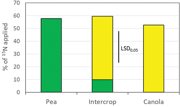 In our study, we evaluated pea and either canola or mustard as intercrops (including monocrop controls) at N fertilizer rates of 0, 45, and 90 lb N/ac (only the monocrop oilseed received 90 lb N/ac). The N fertilizer in the 45 lb N/ac treatment consisted of 15N-labelled UAN. At Lethbridge in 2018, the total recovery of 15N was the same in monocrop and intercrop treatments, but intercropping reduced 15N uptake of pea but not canola (Figure 1). Although pea took up fertilizer 15N efficiently when grown by itself, it was a poor competitor with canola for fertilizer 15N when intercropped. Total N uptake by canola at Lethbridge (104 lb N/ac) was unaffected by intercropping despite a lower seeding rate (30%) and competition with pea. Total N uptake of pea was reduced from 225 to 96 lb N/ac even while the proportion of N derived from N2 fixation increased from 53 to 76%. Similar results were obtained at all site-years.
