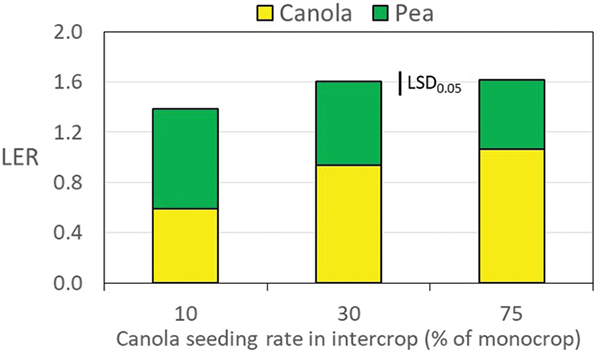 The seeding rates of each crop component in an intercrop can be varied independently. We seeded intercrop pea at 75% of the monocrop rate and included treatments with canola at 10, 30, or 75% of the monocrop rate (Figure 2). The 10% seeding rate reduced LER (insufficient plant density) while the 30% and 75% rates had the same LER but with a higher proportion of canola at the 75% rate. Similarly, Chalmers and Day (2009) obtained the highest LER with planting a full rate of pea and half rate of canola. The impact of seeding rate on LER can be expected to vary with crop type and environmental conditions.