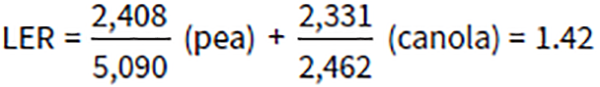As monocrop oilseed crops are typically fertilized at higher N rates than 45 lb N/ac while monocrop pulse crops typically receive little or no N fertilizer, LER should also be calculated at conventional monocrop N rates. Based on monocrop yields of pea at 0 N (5,352 lb/ac) and canola at 90 lb N/ac (3,523 lb/ac), the LER was 1.11—lower but still above 1 due to other benefits of intercropping.