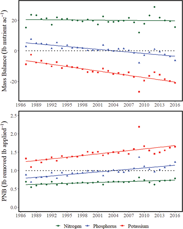 To compliment NUE assessment methods like PFP, investigating the mass balance of a system indicates the pounds of nutrients remaining in the system after both applications and crop removal of nutrients. Mass balance of N, P, and K in pounds of nutrients per acre for the U.S. from 1987 to 2016 is shown in Figure 2. These values represent nutrient inputs (fertilizer, manure, and biological N fixation) and crop removal with harvest of 21 specific crops that are considered within NuGIS. Clear trends of nutrient mass balance for N, P, and K are easily seen in Figure 2 with considerable difference between each nutrient. While N balance trends remained fairly consistent (with visible annual variation), both P and K balances have continually decreased from 1987 to 2016. These trends may raise some questions as to a “mining effect” occurring of P and K from cropland acres within the U.S. Certainly greater P and K are being removed with harvested biomass than is being applied in the form of fertilizer or manure, yet to completely comprehend the nutrient status of a given production field, analysis of soil test P and K would be required. An important takeaway from patterns such as these for immobile nutrients is that crop removal can have a very large influence on the nutrient balance, and thus frequent and comprehensive soil-testing programs should be employed to monitor available nutrient concentrations.