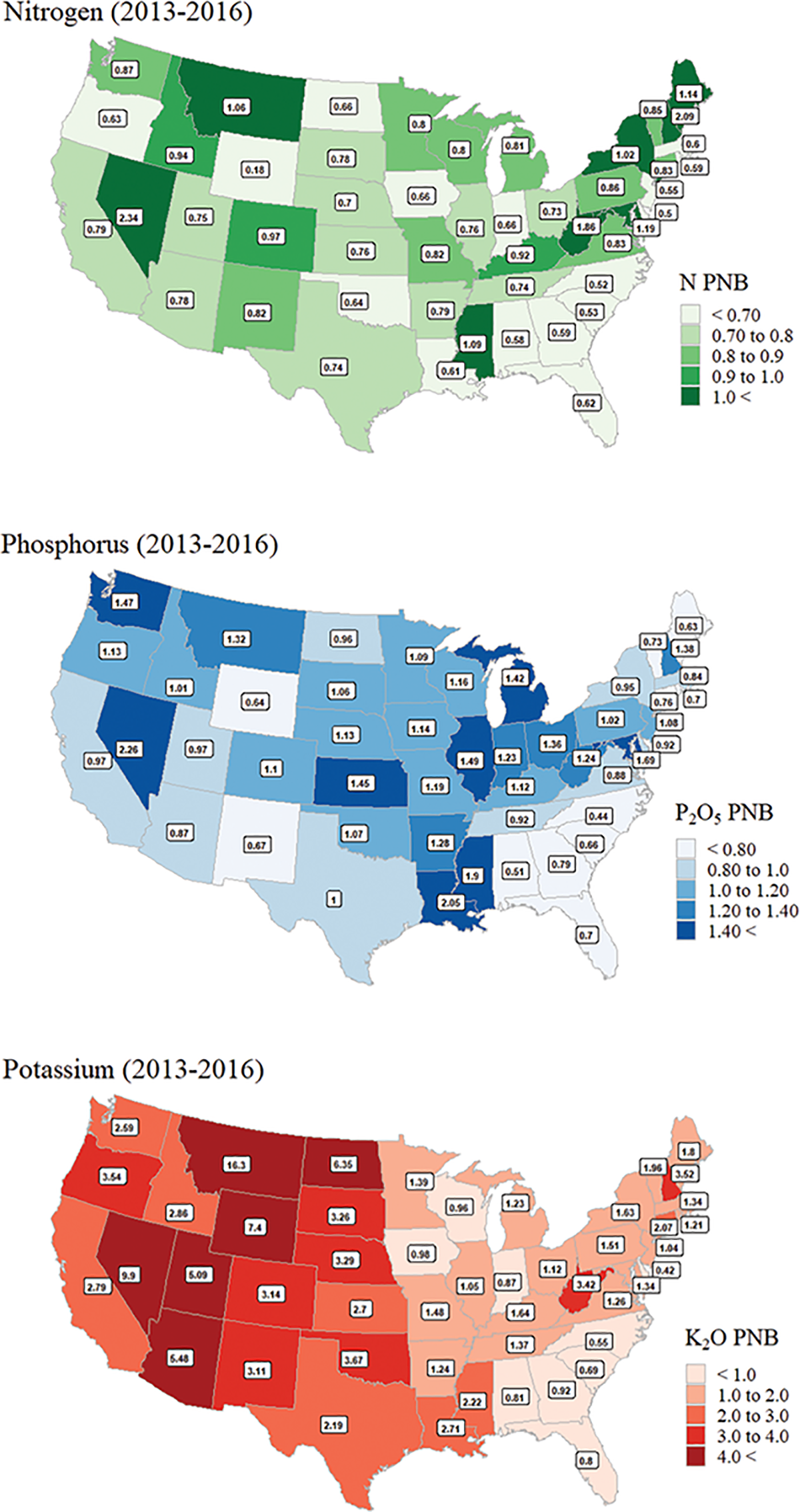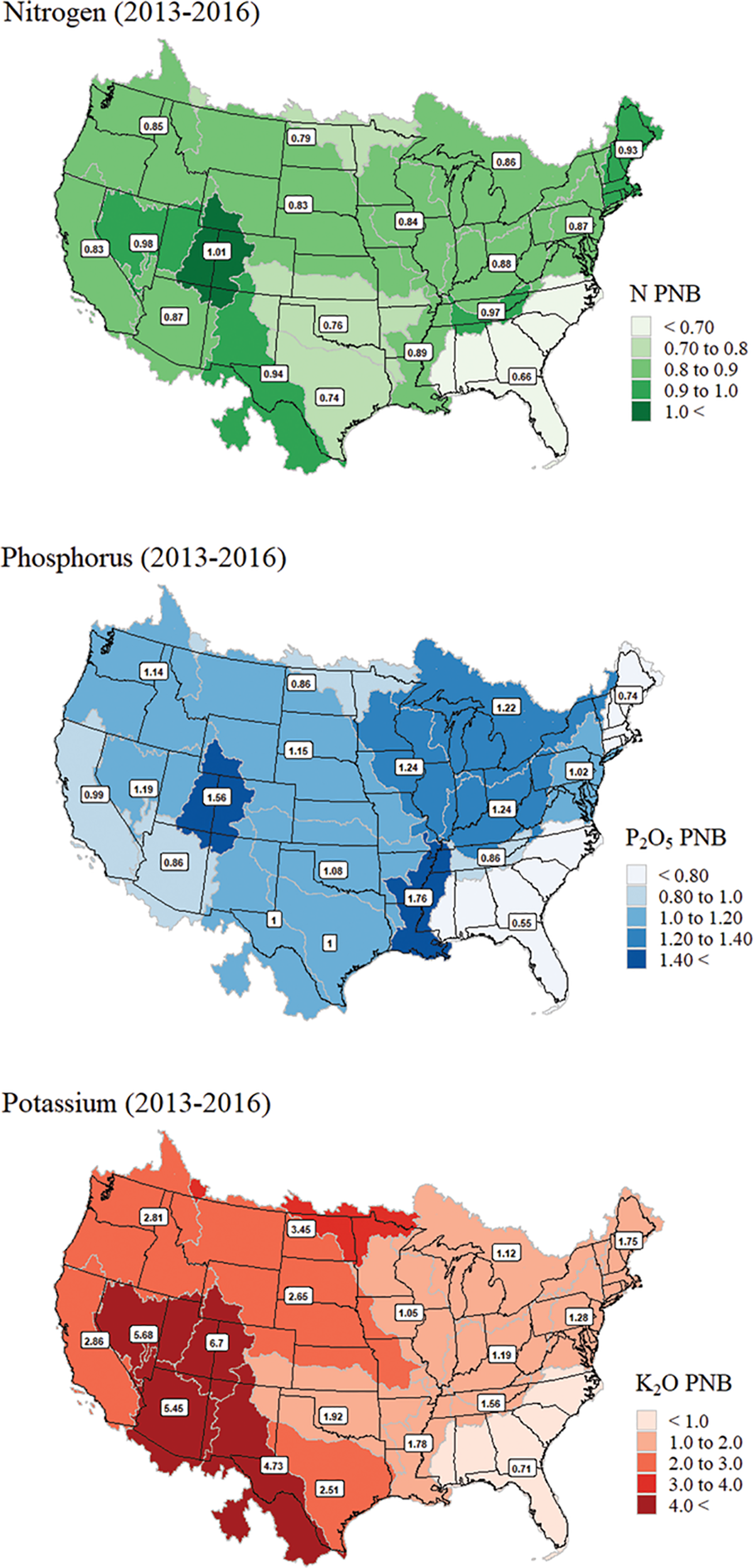 Regionality of NUE values is influenced by many local environmental and management factors. Additionally, NUE will inherently vary by crop, as mentioned earlier. Partial nutrient balance of N, P, and K is shown by U.S. state in Figure 3, and values represent the annual mean of 2013 to 2016. Darker colors indicate larger PNB values or greater removal of nutrients than those entering cropland systems as fertilizer, recoverable manure nutrients, or biological N fixation of legumes. Because of these variables that are considered, regional effects of the degree of fertilizer use, livestock production, and leguminous crops being grown will differ. As with any spatial interpretation of data, local knowledge and expertise can inform why specific NUE trends are seen and the underlying reasoning behind them. For example, regions with greater native soil nutrients may exhibit higher NUE values due to lower applications needed to achieve an economically optimum yield response.