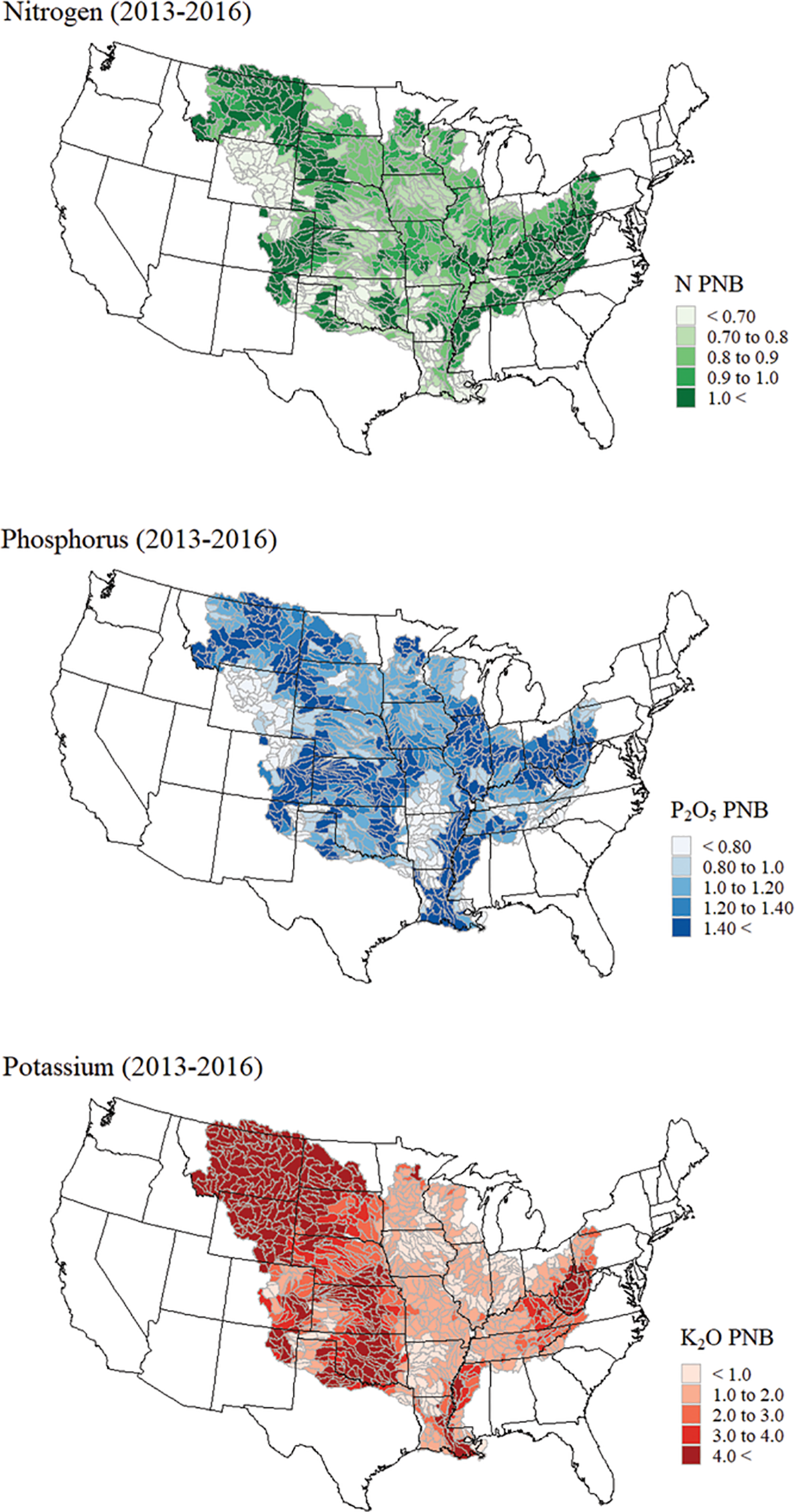 The scale of watershed-level assessments can be further reduced to eight-digit (HUC8) watersheds within larger hydrologic regions (Figure 5). Figure 5 shows the PNB of N, P, and K for each HUC8 watershed within the Mississippi River Basin (MRB) from 2013–2016. It then becomes very apparent that variability within larger hydrologic regions and states exists and can change drastically across the landscape. For example, PNB values for all nutrients vary from less than 0.1 to greater than 25 for HUC8 watersheds within the MRB for the years presented.