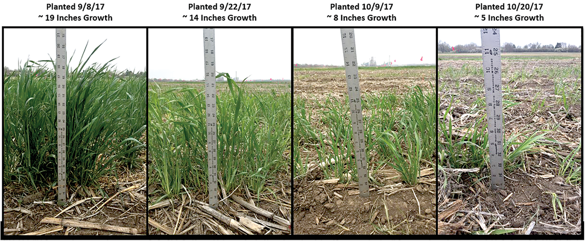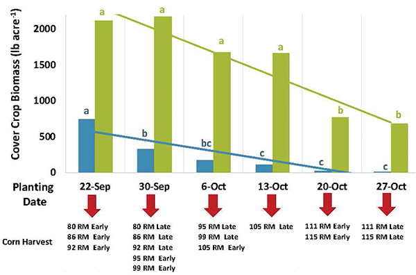 In a corn–soybean rotation, interseeding can allow for planting prior to harvest, extending the growing season for cover crops, but broadcast seed depends on timely precipitation or irrigation for good establishment. Early-season (V3-V6) drill-interseeded cover crops in corn can improve establishment, but cover crop species selection and herbicide program compatibility are important considerations to ensure season-long survival (Figure 1). Cover crop planting within a corn–soybean rotation in the Midwest ranges from mid-September as an interseeded cover crop to mid-November following harvest of corn (Figure 2). Early-fall drill-planting produces more cover crop biomass compared with late-fall planting when following corn–soybean harvest (Figures 3 and 4).