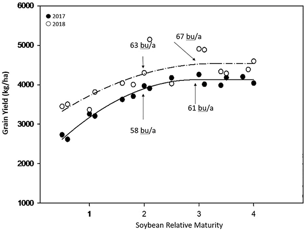 Delayed termination timing in spring can also increase cover crop biomass production. Research at multiple locations in Nebraska showed cereal rye and winter wheat cover crop biomass more than double when delaying termination by two weeks in May (Figure 5). Later cover crop termination, however, could result in delayed crop planting, which may reduce crop yield. Selection of shorter soybean or corn relative maturity groups have the potential to harvest earlier for more timely cover crop planting with little or no yield reduction. Studies in Nebraska and Ohio found that decreasing the soybean maturity group from 3 to 2 resulted in a 3–4 bu/ac yield decrease, but harvest occurred 11–14 days earlier (Figure 6).