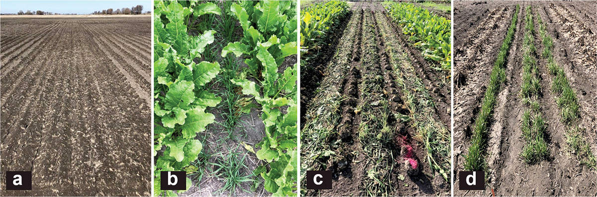 The Red River Valley of North Dakota and Minnesota is a major sugarbeet production region in the United States. In the Northern Great Plains, wind erosion causes significant soil loss from agricultural fields. Due to conventional tillage practices, soils have less residue cover after sugarbeet harvest in the fall (Figure 1a), and the soil is exposed to wind and water erosion. In the spring, severe damage due to wind blast of soil particles can cause sugarbeet stand loss. Cover crops have the potential to reduce the impacts of soil erosion and improve nutrient use efficiency by reducing nutrient loss, fixing nitrogen, and improving soil quality. Interseeding cover crops before harvest increases the likelihood of cover crop establishment and growth (Figure 1b). Cover crops that are interseeded can accumulate more biomass than fall-seeded cover crops and thus have greater potential to reduce soil losses (Figure 1c,d). However, the success of cover crop stand establishment depends on the growing season and cultivar characteristics.