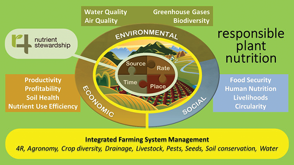 From the start, 4R was designed to improve yield, profit to the grower, soil health, and nutrient use efficiency (Figure 1), and it was always emphasized that those economic outcomes depend on integration with the cropping system. In the Responsible Plant Nutrition concept, that dependence expands to include integration with the whole farming system—including the livestock. The achievement and tracking of progress on environmental and social outcomes depends on integration and collaboration with an even broader range of players in the supply chain to and from the farm (SPRPN, 2020).