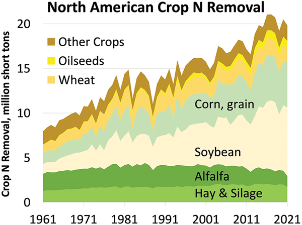 - The amount of N removed per unit of yield likely changes over time for many crops but is not accounted for in most N budgets. In particular, corn grain is lower in N today compared with decades ago (Mueller et al., 2019).