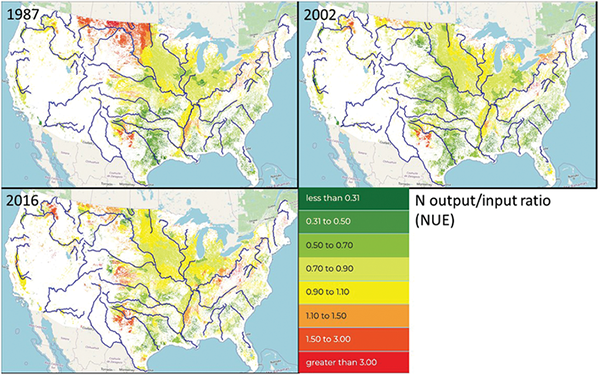 According to the European Expert Panel on Nitrogen (EUNEP, 2016), N use efficiency should be considered in the context of N output and N surplus, and a format similar to that in Figure 3 is recommended, with optimum values between 50 and 90%. The aggregate performance shown for North American crop production has encouraging trends. For the past few decades, both N use efficiency and N output per acre are increasing. But some important caveats need to be kept in mind.