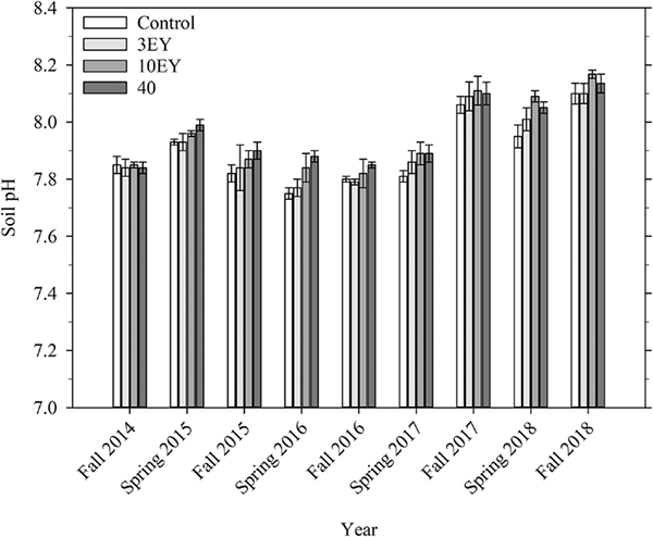 - Soil pH levels varied based on date of measurement. Base pH levels of the control varied between sample time; all other treatments followed the same variation. These temporal variations may be the result of several soil factors such as temperature, soil water, microbial processes, etc.