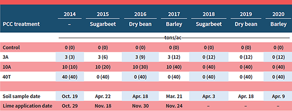 The study was conducted from 2014 to 2020 at the USDA-ARS Northwest Irrigation & Soils Research Lab in Kimberly, ID on a Portneuf silt loam soil. The treatments included four PCC application rate/timings. The treatments included a no lime (Control), 3 tons/ac applied four years in a row in the fall (3A), 10 tons/ac applied four years in a row in the fall (10A), and 40 tons/ac applied in fall of 2014 (40T). The “A” and “T” designations represent “annual” and “total,” respectively. The total lime applied for the 3A, 10A, and 40T treatments was 12, 40, and 40 tons/ac, respectively (Table 1).