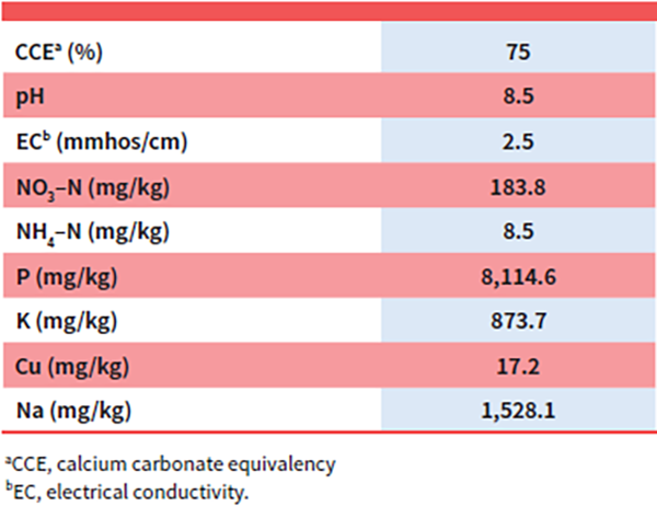 Soils were sampled in the spring and fall of each year from 0 to 12 inches (Table 1). In the fall of each year, the soil sampling was done before PCC application. The soil samples were analyzed for pH (Kalra, 1995), electrical conductivity (EC) (Rhoades, 1996), Total P, bicarbonate extractable P (Olsen P; Olsen et al., 1954), NO3–N and NH4–N (Mulvaney, 1996), and total C and N using a FlashEA1112 CN analyzer (CE, Elantech, Lakewood, NJ). Due to the significant concentration of P in the PCC (Table 2) and the marginal concentrations in the soil over the study area, to eliminate the crop productivity responses to P, in spring 2015, 400 lb P2O5/ac (monoammonium phosphate fertilizer) was applied over the entire study area. Soil fertilizer recommendations were determined each year based on University of Idaho recommendations for each crop.