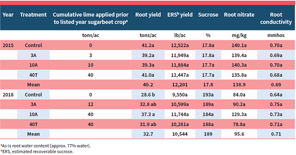 - For sugarbeet, the only statistically significant effect PCC had was on sugarbeet root yields in 2018. This significant difference in sugarbeet root yield was not easily interpreted according to PCC application rates and timings. Increased root yields in 2018 with PCC could have been the result of increased P concentrations in the soil, but the control treatment soil P levels were sufficient based on soil test recommendations. Also, there were greater differences in soil P between PCC treatments and the control in 2015 with no differences in root yield. It is common in research studies to have significant differences between treatments that are not explained by the treatments.
