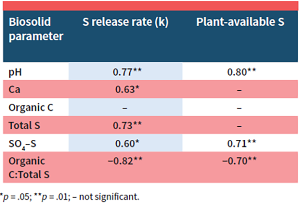 Biosolid pH and organic C:total S ratio as well as total calcium (Ca), total S, and SO4–S concentrations were highly correlated to either S release rate (k), plant-available S, or both (Table 3). Biosolid organic C:total S ratio is likely connected to the S mineralization of organic S compounds while Ca and pH correlations to S availability could be connected to gypsum (CaSO4) dissolution and the oxidation of hydrogen sulfide compounds. The correlations proposed here may need to be further investigated and verified on additional soil types and under field conditions prior to grower adoption.
