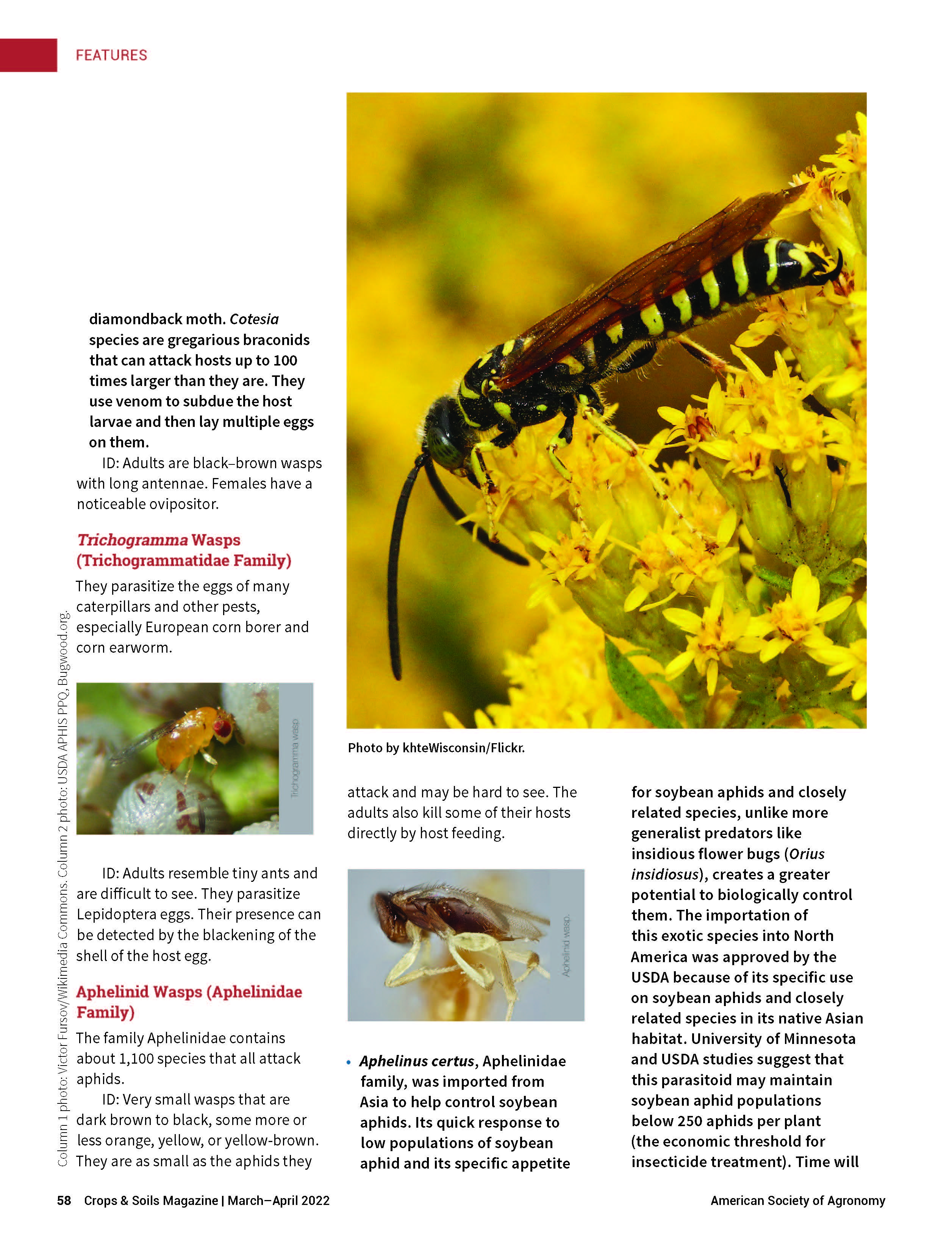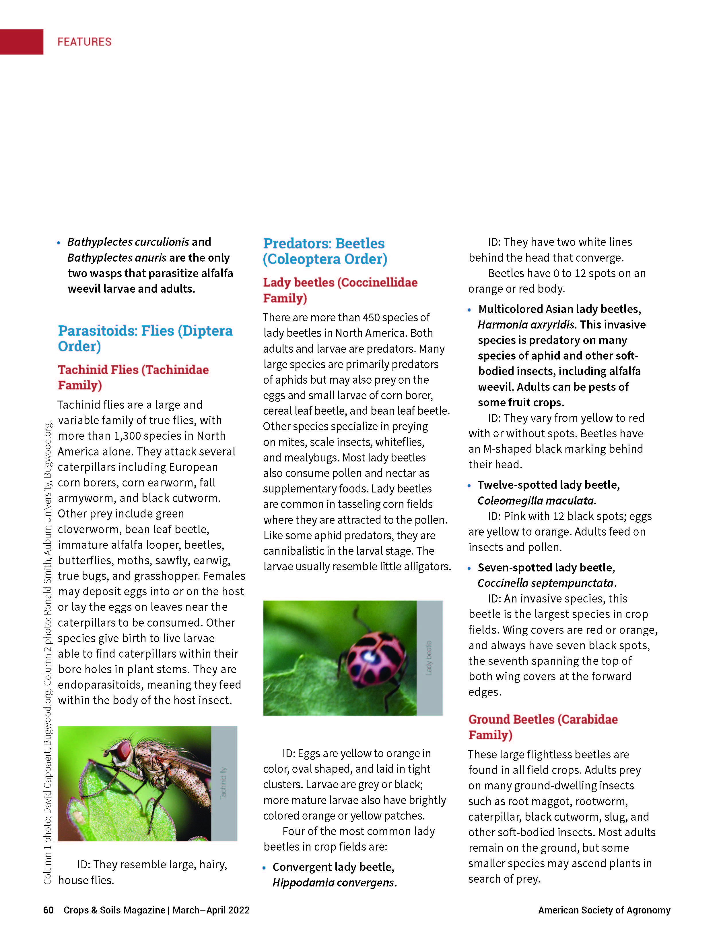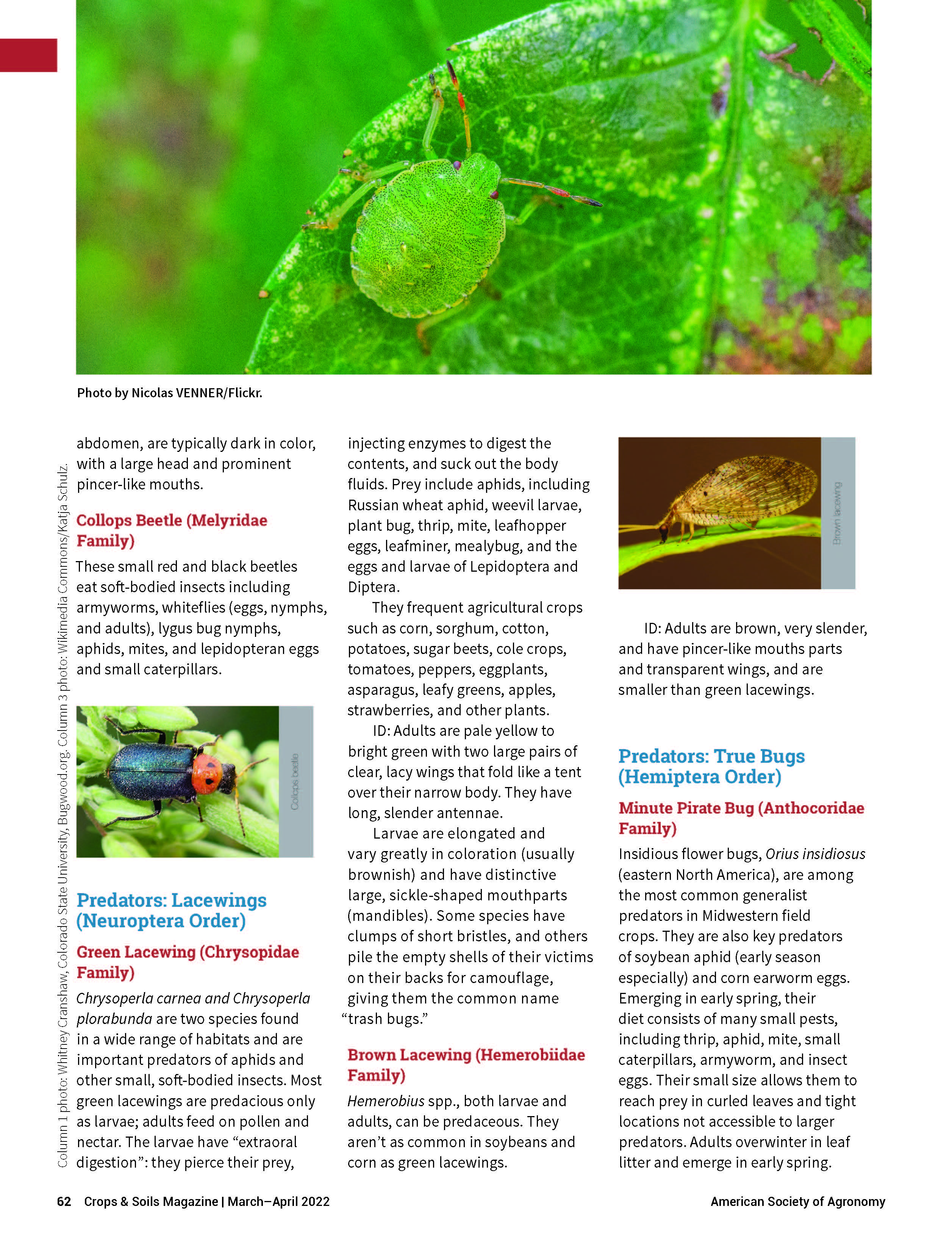 This article is the first in a three-part series on beneficial arthropods. It will highlight some beneficial insects that kill crop pests and are largely unnoticed in the Corn Belt and Great Plains. The focus will be on two groups of insects that survive by eating insect pests of crops: predators and parasitoids. Information for this article comes from the University of Illinois, Iowa State University, Kansas State University, Michigan State University, University of Minnesota, Texas A&M University, and Utah State University.