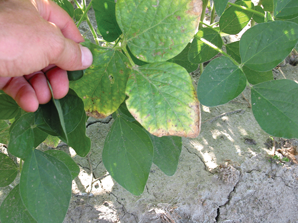 Soybean leaf scorching and dessication increased as tissue chloride concentrations increased, after the R5.5 stage, in Slaton’s research. Parker et al. (1983) also noted chloride-sensitive cultivars developed leaf scorch during pod development, and yields were 37% less compared with tolerant cultivars in soil with naturally high chloride concentrations. “Yield loss from chloride toxicity can occur without visible season-long symptoms—symptoms may not appear until very late in the growing season, presumably due to chronic chloride accumulation from applied irrigation water,” Slaton says. “Symptoms’ late appearance is an important aspect of chloride toxicity and highlights the need for diagnostic information that would aid in early toxicity detection.”