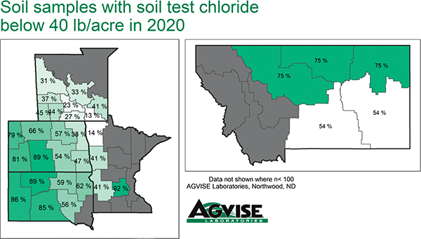 “In the Northern Great Plains, its correlation with soil test potassium (K) goes two ways,” says John Breker, CCA and soil scientist, Agvise Laboratories, Northwood, ND. “Soils with low soil test K are often coarse textured and well drained. They often leach chloride, especially if irrigated. At the opposite end of the spectrum, chloride-deficient soils with high soil test K do not warrant potash application (KCl, 0-0-60) to meet crop K requirements. They are often naturally low in chloride and, without potash application, do not receive any chloride. Therefore, these soils stay low in chloride. This is the story across much of the Northern Great Plains where small grains could benefit from a modest application of 10 to 20 lb/ac chloride.”