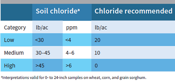 A K-State agronomy reference notes that, “It is difficult to predict whether chloride would significantly increase wheat yields unless there’s been a recent soil test analysis. Chloride fertilization based on soil testing is becoming more common in Kansas.” Most Kansas soils sampled had chloride levels below 40 lb/ac with many samples below 10 lb/ac, using 0- to 24-inch samples.