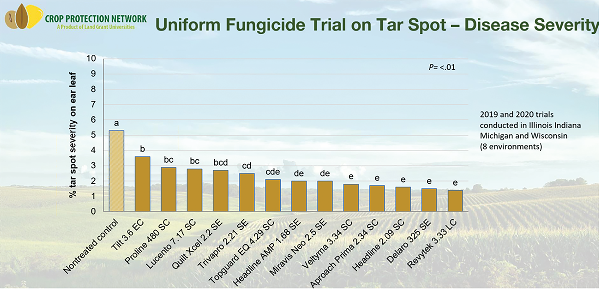 A 2019 Indiana tar spot fungicide trial found a change in corn yield of 3.5 bu/ac to 21 bu/ac in fungicide-treated corn compared with nontreated corn.
