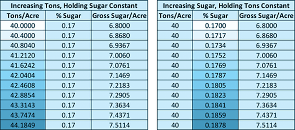 On the left, you see what happens if we increase tons by 1% while holding percent sugar constant at 17% compared with the previous line. On the right, you see what happens if we increase percent sugar by 1% while holding tons constant compared with the previous line. You will note the gross sugar/acre remains identical in both scenarios. This data does not consider other factors that impact recoverable sugar (i.e., purity, nitrates, amino-N, etc.).