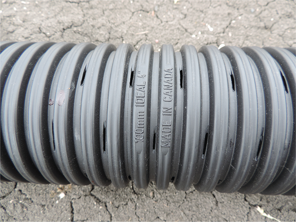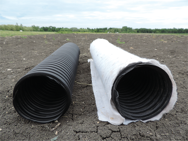 Next, every system has what’s called “tile” itself: 3- to 15-inch-diameter pipes, usually made of perforated plastic piping (PVC or corrugated) though it could also be made of clay tiles or concrete. The piping is then laid in lines between 20 and 60 ft apart, 3 to 5 ft deep beneath a field, with connecting pipes laid in between. The distance between pipes is dictated by each field’s individual characteristics.