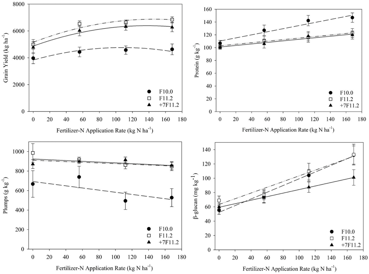 Beta (β)-glucans are soluble fiber compounds that are used as a quality indicator for malted barley. This was the only measured quality factor where the well-watered F11.2 treatment behaved similar to the water-stressed F10.0 termination across N rates. Malted barley grain β-glucan targets should be below the threshold of 100 ppm. Increased N application at the highest rates applied in the research study resulted in elevation of β-glucan above the published target rate for both the F10.0 and the F11.2 irrigation terminations. Additional irrigation from the +7F11.2 treatment resulted in decreased β-glucans at all N rates compared with the other termination times.
