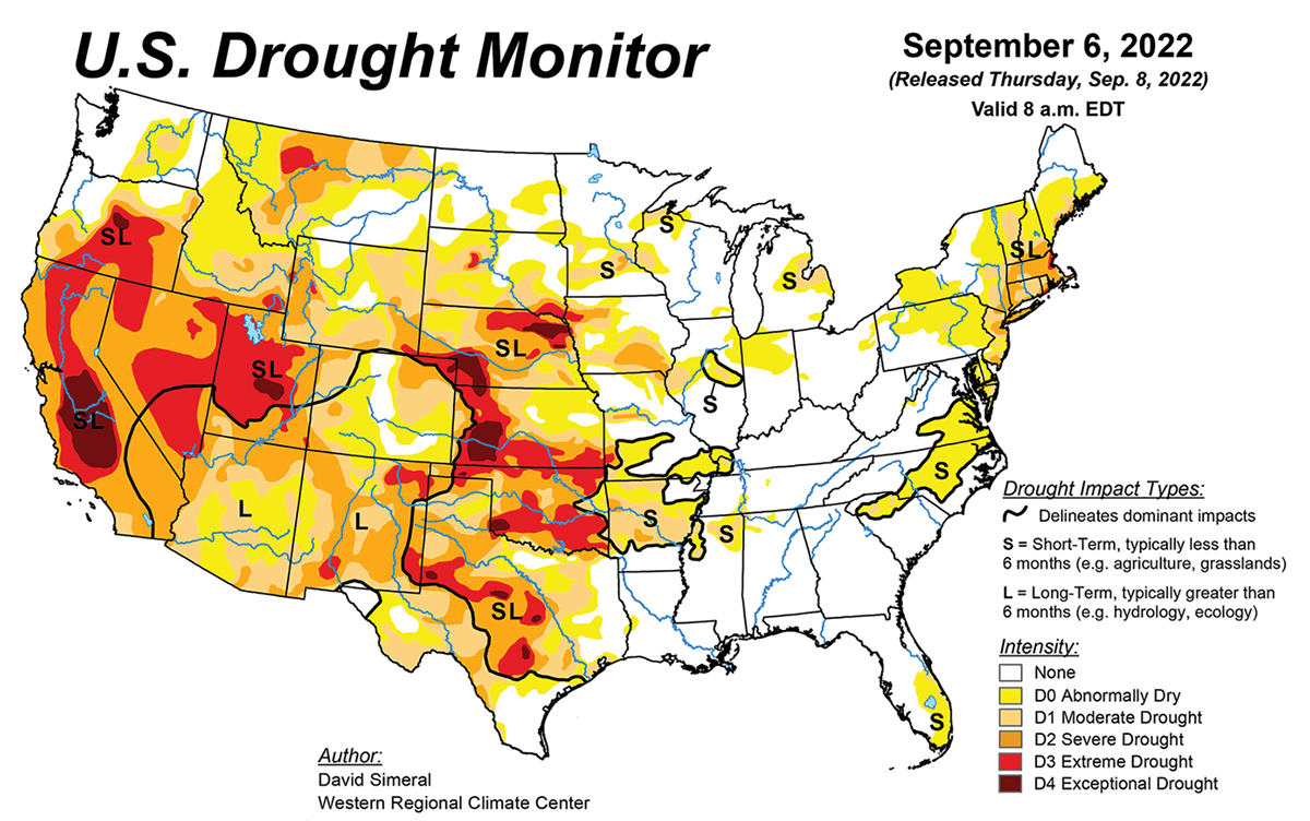 In early September, prolonged drought conditions were affecting 80% of the High Plains (North and South Dakota, Nebraska, Kansas, Colorado, and Wyoming), according to the Drought Monitor. That’s up from three months and a year prior but down from the start of the calendar year. Just over 60% of the South (Oklahoma, Texas, Arkansas, Louisiana, Mississippi, and Tennessee) was in drought conditions, up significantly from 2021. And 88% of the West was under drought conditions, which is actually less than it was three months ago, at the start of the calendar year, and one year ago.