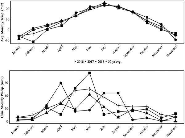 Temperatures during the study period did not vary significantly from long-term trends. However, all three years of the study were below the long-term average for precipitation—particularly in 2017. The yearly, cumulative growing-season precipitation was 77, 61, and 83% of the long-term average for 2016, 2017, and 2018, respectively (Figure 3).